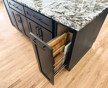 This transitional design combines classic craftsmanship with modern efficiency, tailored to the client's goal of maximizing creative storage solutions. Crisp white upper cabinets contrast with the stained black bases, while sleek elongated hexagon tiles and granite countertops anchor the palette with texture and depth. Numerous cabinets are outfitted with Rev-A-Shelf accessories to enhance organization and accessibility- creating a space that's as functional as it is refined. Stainless steel appliances and matte black fixtures complete the look, blending performance and style.