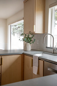 When designing this kitchen, the priority was to keep the existing floor. This meant designing with layout restrictions, as we could only modify the cabinet plan so much. Our other goals were to maximize prep surfaces and create more functional storage for cookware and pantry items. After months of collaboration and creativity, our client's dream kitchen came to life! In addition to meeting our functional goals, we created a modern space with clean lines, organic textures, and subtle touches of glam.
