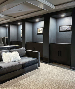 This walkout basement turned media room was an exciting design challenge. The shell of the room was built to contain several alcoves of varying sizes. Within most of the alcoves, there was a lower foundation wall projecting into the space. To maximize storage, custom cabinets were designed for each alcove with a reverse kick on the backside to accommodate the foundation wall. Accent lighting was added to each alcove to highlight family photos. A custom bar was added to an elevated platform at the back of the room; a perfect spot to entertain before watching a movie.